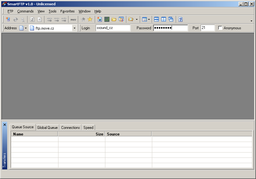 Spusťte SmartFTP. K vzdálenému FTP serveru se připojíte tak, že vyplníte adresní lištu, přihlašovací jméno a heslo.